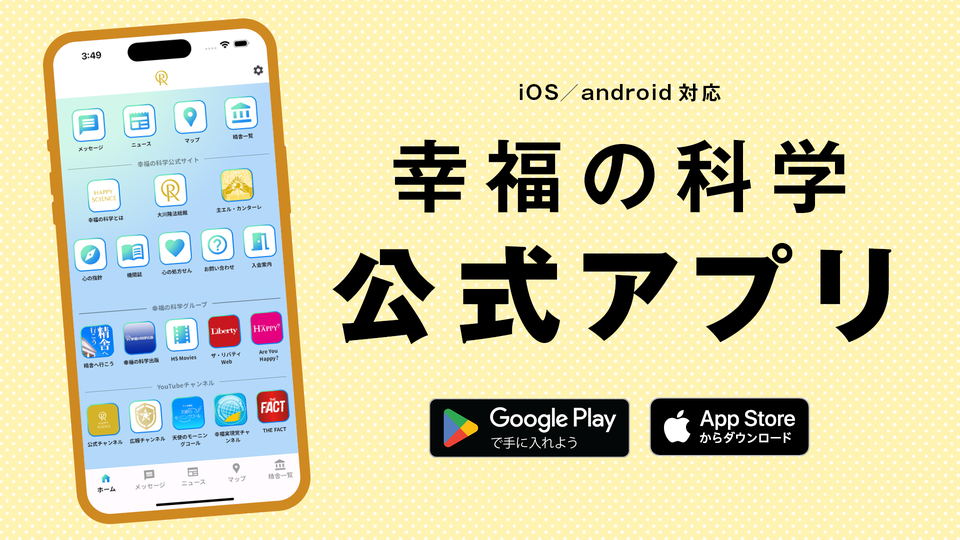 「幸福の科学公式アプリ」は、幸福の科学の行事、新刊など、最新情報をお届けするほか、お近くの支部や精舎にすばやくアクセスするためのマップや、精舎カレンダーの閲覧機能などをご用意しています。